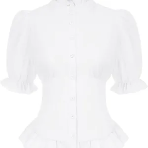 Womens Vintage Victorian Puff Sleeve Blouse Button Down Ruffle Dressy Shirts Tops